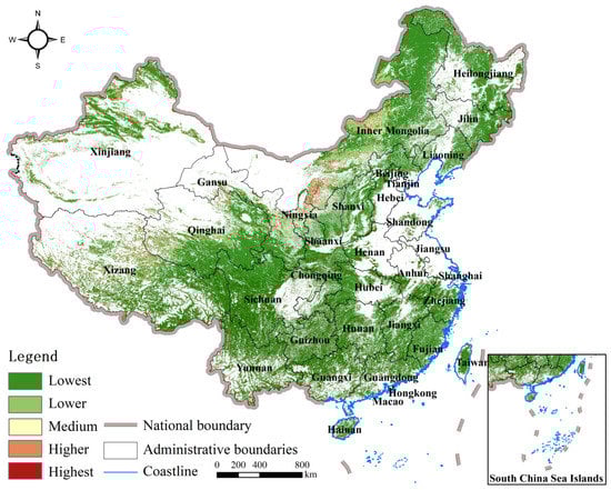 The boundary data used in this study include China’s administrative boundaries and the scope of the CES. The vector data of China’s administrative boundaries were obtained from the National Administrative Division Information Query Platform, which includes the boundary areas of 34 provinces, municipalities, or special administrative regions in China. (http://xzqh.mca.gov.cn/map (accessed on 24 September 2022)). It is mainly used to analyze the differences of CS in different regions at the administrative unit scale. The scope of CES has been extracted from the multi-period remote sensing monitoring dataset of China’s land use/cover changes (CNLUCC), obtained by the Resource and Environmental Science and Data Center of the Chinese Academy of Sciences (https://www.resdc.cn/ (accessed on 24 September 2022)) []. The time of the data is 2020, and the spatial resolution of the data is 1000 m × 1000 m, including woodland, shrubland, sparse woodland, other woodland, high-coverage grassland, medium-coverage grassland, low-coverage grassland and other vegetation-covered areas. The dataset is constructed by human–computer interactive visual interpretation. Its basic data is the remote sensing data of Landsat MSS, TM/ETM, and Landsat 8 satellites and supplemented by the charge-coupled device multi-spectral data of China Environment 1 Satellite. In the process of interpretation, Liu et al. [] referred to the existing grass map, vegetation map, and topographic map to ensure the reliability of the dataset and verified the accuracy of the dataset by randomly sampling the verification line, which reached 95.66%. In addition, before extracting the boundary of CES, the boundaries of forest and grassland were compared between this dataset with the land cover data of Moderate-resolution Imaging Spectroradiometer (MODIS) [] and global land 30 []. It was found that in China, due to the lack of field verification points, the land cover data of MODIS and Global 30 were not well evaluated and corrected. There is a small estimate of the area of ES in China. Therefore, we finally adopted the boundary of CES extraction from CNLUCC.
