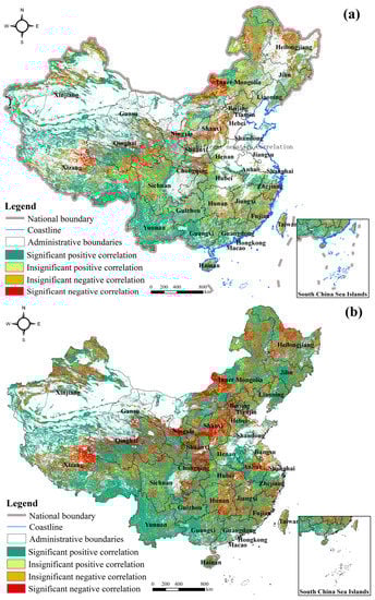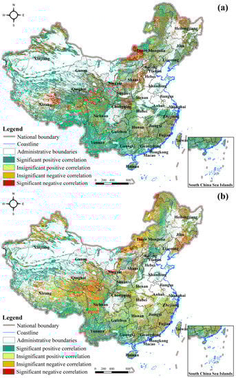 Figure 10 shows the correlation coefficient of CS in CES with temperature and precipitation. As shown in Figure 10, the CS in CES is highly positively correlated with precipitation change, with an average correlation coefficient of 0.085. The area showing a significant positive correlation between CS and precipitation accounted for 53.12% of the total CES area, and these areas were widely distributed in the whole area of CES. The area with the most significant negative correlation between CS and precipitation accounted for 25.49%, and these regions were highly coincident with the regions with low spatio-temporal stability, as described above, and were located around the 400 mm isohyet of China. The areas showing significant positive correlation between CS and temperature accounted for 41.63% of the total CES area, and the distribution area was relatively scattered, indicating that the promotional effect of temperature on CS in CES was obviously weaker than that of precipitation. The areas showing a negative correlation between CS and temperature accounted for 32.37% of the total area of CES. They were distributed in a concentrated way, and mostly located in GES. This may be due to the fact that temperature rise leads to an unsynchronized water and heat demand for vegetation growth in grassland, which inhibits the CS of grassland to a certain extent [].