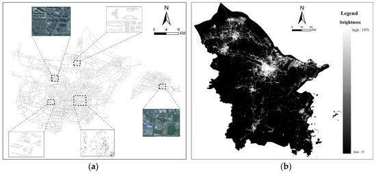 (a) The research units segmented by OpenStreetMap network, remote sensing images, POIs and building footprints in some sample units. (b) Night lights in Ningbo City.