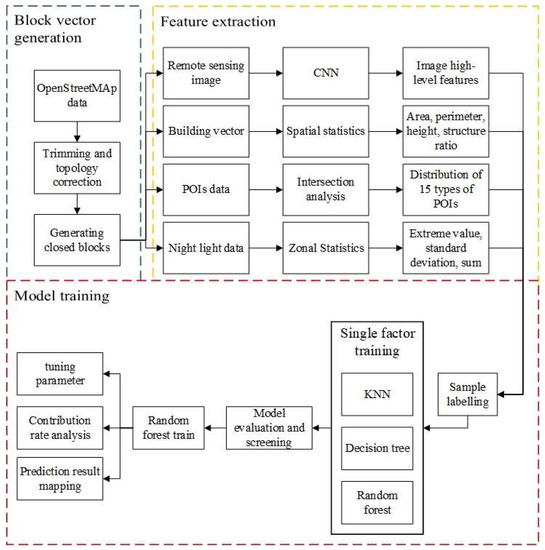 The first step was feature extraction of multisource data, including the following: (1) measuring physical properties of buildings based on planar vector data of buildings. We collected the area, perimeter, number of floors, and structure ratio of all buildings, and then counted the sum, average, and standard deviation of building features in each block (segmented by road network)—a total of 12 features. (2) We counted the number of various POIs in each block to characterize the characteristics of the social and economic activities of the block. (3) With the help of GIS grid division statistics method, we calculated 10 statistical values. such as the sum and standard deviation of nighttime light brightness, in each block to reflect the nighttime economic characteristics of the block. (4) Using CNN, we detected hidden spatial information from remote sensing images. The number of neurons in the output layer of the convolutional neural network determines the length of the extracted features. After extracting these features, we labeled the selected typical samples by visual interpretation. Then we used the nearest neighbor, decision tree, and random forest algorithms to train individual and combined features to compare the accuracy. Finally, the random forest algorithm, which had a better ensemble learning effect, was used to predict the functional area, and the weight of different features in the classification task was calculated to analyze the contribution of different features in the classification process. The method flowchart is shown in Figure 3.