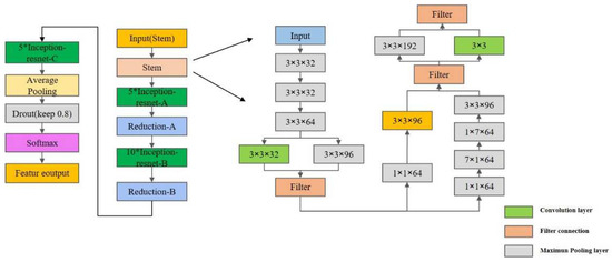 In this study, the Inception ResNet V2 network was used for scene feature extraction of blocks—that is, the Inception structure is combined with the residual structure of ResNet [44]. The network structure is shown in Figure 4. As we can see, Inception ResNet V2 network uses several maximum down sampling layers for data dimensionality reduction before convolution, and then inputs data to different branches for convolution and pooling operations. After that, features of different branches are channeled. The extracted different features are fused. The network continuously passes the features through Inception structure and ResNet structure, and then executes a mean downsampling operation to input the features into the Dropout layer for feature screening to prevent overfitting. Finally, we obtain the desired feature parameters through the SoftMax layer.