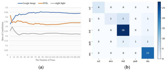 The model constructed a total of 72 decision trees, with each decision tree predicted according to the characteristics of the sample. In this model, different features had different effects on the results. As can be seen from Figure 6a, the contribution rate of image features was the highest, the features of POIs were second, and the contribution rate of building vectors was the lowest, which corresponds to the training accuracy of different data sources. Datasets that performed well in individual prediction also had a higher contribution rate in combined predictions. According to the confusion matrix of the prediction results of the ensemble learning model on the validation set (Figure 6b), the classification effect of the residential living space and production space, including agricultural production space and industrial and commercial production space, is good, and there is almost no wrong classification. However, the proportion of errors in the classification of public living space and ecological space is relatively high. Due to the small area and less distribution of these two types of space, which are basically surrounded by residential areas, a large proportion of samples are misclassified into residential areas or commercial areas, which also limits the validation accuracy of the whole model.