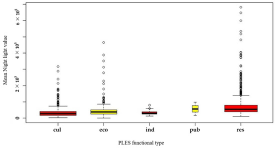 Although high-resolution image data and POI data have a high contribution to the classification of urban functional areas, the features extracted from high-resolution remote sensing image data and POI data lose their interpretation significance for functional areas. Therefore, we counted the mean values of night light in different functional area types of blocks in the prediction results, and plotted box plots as shown in Figure 7 to test and explain the role of night light data in PLES partition. As can be seen from Figure 7, among the five types of functional areas, the mean value of nighttime light brightness in agricultural production space is the lowest, and the brightness value of industrial and commercial production space is also low. On the contrary, the living space including public living space and residents living space at night light brightness value is higher. This is consistent with the actual law: urban residents work in the living space during the day and return to the living space to rest at night. On the other hand, the luminance values of each block in agricultural living space, ecological space and residential living space are relatively high in outlier samples, which to some extent implies that the classification of urban functional areas cannot be based only on the luminance values of nighttime lights. At the same time, some outliers such as high-brightness blocks in agricultural production space and ecological space may be the basis for misclassification.
