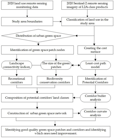 The principles of landscape ecology are widely used in urban green space planning to guide green space networks at different levels in regions, cities, and communities [20,21,22], laying the foundation for developing urban green space network models for research. Kong et al. pioneered an urban green space network model using the least-cost path method to identify potential corridors in Jinan and developed and improved a green space network based on Graph Theory and Gravity Model for biodiversity conservation. In addition, they used land use type as the basis for resistance allocation by selecting cores based primarily on the patch size [14,23]. Wu et al. constructed a network of green spaces through the landscape connectivity index and the least-cost path method supported by RS and GIS technology. They then used the corridor curvature index to identify corridors that needed additional optimization [24]. Some scholars have also addressed the ecological source problem by using morphological spatial pattern analysis and ecological connectivity index analysis methods to construct an ecological network system of green spaces in the study area based on the landscape pattern of green spaces in the study area [25]. Mougiakou et al. argued that connectivity plays an important role in controlling and assessing the structure of generative networks. They established a generic methodological framework to evaluate and optimize urban greening networks in dense urban areas [26]. In summary, selecting green space patch nodes, creating the cost surface, and identifying the green space corridors are all essential to construct an urban green space network. The selection of green space patch nodes typically considers green space area and species richness [27], landscape connectivity [14,24,28], morphological characteristics, and spatial distribution [29,30,31]. The proper resistance factor is normally determined by the field circumstances of the study area before creating a cost surface. According to certain studies [32], cost surfaces are produced based on factors like land cover, height, slope, and population density. Several research surfaces [33,34] have been created by assigning values to factors such as land cover and landscape type. The least-cost path model is frequently used to identify corridors [35,36,37]. Concerning the spatial scale of the green space network, studies have been conducted at a variety of spatial scales, including the city [38], central city [39], and watershed [34]. In addition, studies have shown that building a network of green spaces can manage stormwater [40], optimize the layout of green infrastructure [41] and harmonize cities with nature [42].