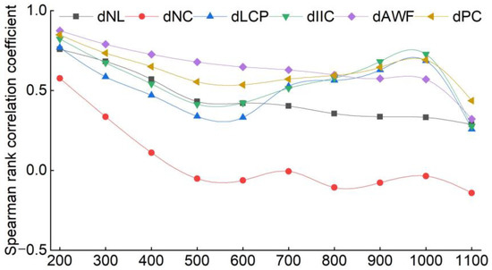 The sensitivity of the significant value of the connection index to changes in the connectivity threshold was analyzed using Spearman’s rank correlation coefficient. The sensitivity of NC to threshold adjustments is most significant when the connection threshold is decreased from 0.577 (200 m) to −0.141 (1100 m) (Figure 4). With the highest value of 0.849 (200 m), the lowest value of 0.437 (1100 m), and the lowest rs difference of 0.412, we can say that the PC connection index is the most stable when the threshold changes.