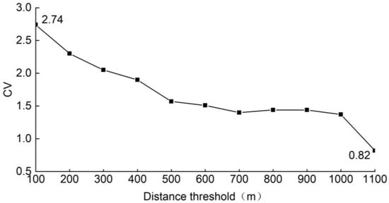 Coefficient of variation of values under different distance thresholds.