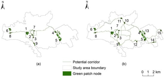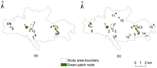 According to the size of the area, we chose fifteen ecological green patches (Figure 6b), including almost most parkland with high recreational service value, with a total area of 3.18 square kilometers to cover the entire study area. We found that the new green space patch 10 belongs to protect green space, and patches 11–15 are five affiliated green spaces. In general, patches 1–15 are large green patches in the study area, containing more biological species, and can be used as the source of green patches for constructing a green space ecological network.