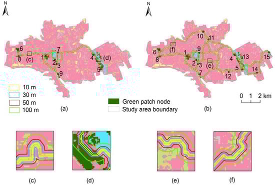 Potential green space networks based on buffers of different distances: (a) recreational network; (b) biodiversity conservation network. Note: (1) People’s Park; (2) East Lake Park; (3) South Lake Park; (4) Xiao Yalang Wetland Park; (5) Dongcheng Park; (6) West Park; (7) Times Squar; (8) Chalbagh Style Park; (9) Kashgar River; (10) Woodland; (11) Xiangfei Garden; (12) Shade belt; (13) Woodland; (14) Kashgar University; (15) Shang Yalang Reservoir; (c–f) are detail images.