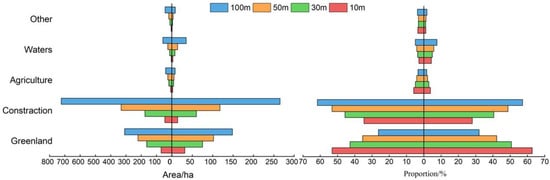 Our green space corridor level is urban land, where the land resources are scarce, which also needs to consider ecological benefits and space requirements for economic development. Therefore, it is particularly important to use the corridor buffer to determine the reasonable corridor width, to strengthen the rationale and science of the construction of green space networks. Under the premise of satisfying the migration and biological conservation functions of birds and small organisms [43], we selected the corridor buffer zone of 10 m, 30 m, 50 m, and 100 m for the width (Figure 8). We then determined appropriate corridor widths for the study area based on the proportion of different land use types within the buffer zone (Table 4 and Table 5).