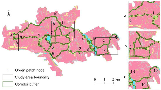 We regarded the top 15 patches as ecological green space patch nodes among green space patches with an area of more than 1 hm2 in the study area according to the size of the area.
