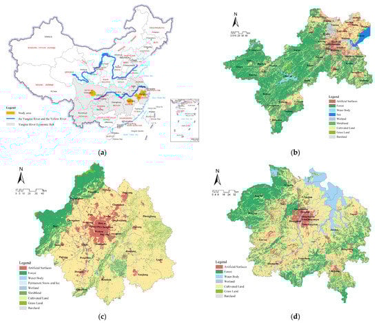 Study areas. (a) Locations of the study areas in China. (b–d) land use of the Hangzhou, Chengdu, and Nanchang metropolitan areas, respectively.