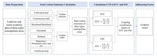 In this study, the total LUCE of each metropolitan area is obtained by measuring the number of sources and sinks of LUCE in the three stages of metropolitan areas. The relationship between the ECC and ESC of each district and county in the metropolitan areas is studied by the CCD model, and the STIRPAT model is introduced to investigate the dominant factors affecting LUCE in the three types of metropolitan areas. Figure 2 shows the analysis clue of this study.