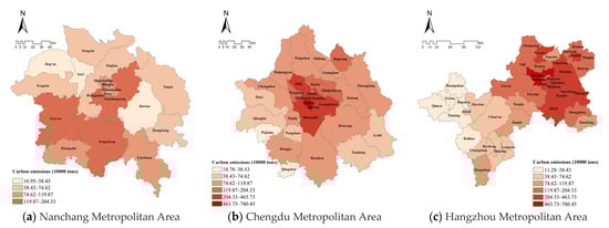 The spatial distribution characteristics of LUCE in NMA, CMA, and HMA metropolitan areas are weak core cluster type, strong core cluster type, and flat extension respectively. Based on the natural breakpoint method, the sources and sinks of LUCE of the three metropolitan areas were reclassified, as shown in Figure 3 and Figure 4. The areas with high carbon emissions (more than 74.62 × 104 tons) in NMA are mainly concentrated in the southwest, probably due to the higher development level of the economy in its southwest, such as the “Feng-Zhang-Gao” (Fengcheng-Zhangshu-Gaoan) industrial development area. The areas with high carbon sinks (more than 4.49 × 104 tons) were mainly concentrated in two parts (the northwestern and southeastern parts) of the region. However, the LUCE of districts or counties in the CMA shows an obvious “core-edge” spatial distribution pattern, with carbon emissions decreasing from the middle to the periphery of the metropolitan area. Areas with large carbon absorption are in the northwest of the CMA. The cause of this spatial distribution may be due to the concentration of construction land being mainly distributed in the central CMA, and the fact that the non-agricultural industries are also most developed in the central part of the area and the central city of the metropolitan area is more attractive. The spatial distribution of LUCE in the HMA shows a “flattened” extension. Areas with large carbon emissions (more than 74.62 × 104 tons) are distributed in the northeast of the metropolitan area. Areas with large carbon absorption (more than 4.49 × 104 tons) are concentrated in the southwest of this metropolitan area. From the west to the east, the carbon emissions of districts or counties gradually increased.