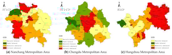- The districts or counties with a higher economy contributive coefficient (ECC) are generally concentrated in the central cities or on the periphery or edge of the metropolitan areas. The districts or counties with higher ecological support coefficient (ESC) in the three metropolitan areas are in the peripheral areas of each metropolitan area. Meanwhile, the more developed the metropolitan area, the lower the CCD between ECC and ESC. The more economically developed districts or counties are within the metropolitan area, the lower CCD is.