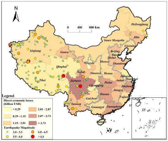 Precipitation and earthquake are two of the major factors for triggering disasters in China [41,42,43,44,45,46,47]. Here, we also selected the frequency of earthquakes (including of magnitudes 5.0–5.5, 5.5–6.0, 6.0–6.5 and 6.5 and above) and direct economic losses as indicators to discuss the seismic effects on disaster mitigation and reduction in China.