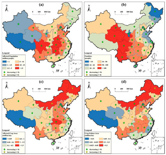 Regarding the affected population, except for Tianjin and Shanghai (Figure 3a), the provinces all presented a decreasing trend. However, there were three cutoff points during the study period. In 2010, approximately 425.18 billion people were affected by natural disasters. The main reason is that a 7.1 magnitude earthquake struck in Yushu of Qinghai province; this event caused significant losses to China, and 2220 people died. Another big disaster was the mudslide which hit the Zhouqu County of Gansu on August 8, which killed 1434 people. Then, in 2013, due to the 7.0 magnitude earthquake in Ya’an of Sichuan, a total of 196 people were killed, 21 people went missing and 11,470 people were injured. In 2016, a huge flood happened in Beijing, Tianjin, Shanxi, Shandong and Henan because of the heavy rainfall between the 18th and the 23rd of July. That event caused 325 fatalities. It can be seen that the people affected by natural disasters in each of the three economic zones and the whole of China showed a decreasing trend. In most situations, the Central Economic Zone had the largest number of disaster-affected people in each year, followed by the Western Economic Zone, and the Eastern Economic Zone had the least number of disaster-affected people (Figure 5a). Only the fatalities in Shanxi increased over time; the fatalities in the remaining districts all decreased (Figure 3b). Most deaths were in 2010 because of the two catastrophic disasters mentioned above. The decreasing trend was greater in the Western Economic Zone than the Eastern Economic Zone and Central Economic Zone (Figure 5b). The affected crop area generally decreased, but it increased in Ningxia, Inner Mongolia, Heilongjiang, Jilin, Liaoning and Shanghai during the period 2010–2020 (Figure 3c), among which the affected crop area in Heilongjiang increased the most, by 1.7 million ha per year. Meanwhile, the affected crop areas in Shandong and Hunan decreased by 2 million ha per year, and even decreased most at more than 6 million ha per year in the Eastern Economic Zone (Figure 5c). In Yunnan, the crop failure area decreased by an amount exceeding 0.8 million ha (Figure 3d). Only the Western Economic Zone presented a fluctuating decreasing trend; there were no obvious trends in the Central Economic Zone or Eastern Economic Zone (Figure 5d). As for the direct economic losses, several provinces, including Heilongjiang, Tianjin, Ningxia, Chongqing, Hubei, Anhui, Zhejiang, Shanghai and Guangxi, all presented an increasing trend, especially the direct economic losses in Anhui exceeding 0.57 billion USD per year; the others all had decreasing trends. The direct economic losses caused by natural disasters showed a fluctuating decreasing trend; there were no obvious trends (Figure 5e).