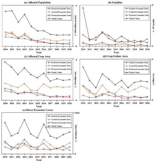 Trends in (a) affected population, (b) fatalities, (c) affected crop area, (d) crop failure area, (e) direct economic losses caused by natural disasters, from 2010 to 2020, in China.