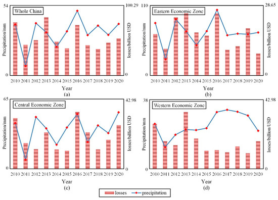 China is mainly affected by the southeast monsoon and southwest monsoon. The southeast region is rainy and wet, while the northwest region has scarce rain and is dry, and the spatiotemporal distribution of atmospheric precipitation is extremely uneven. We analyzed the spatial and temporal distribution characteristics of annual mean monthly precipitation and the annual economic losses directly caused by natural disasters in the whole of China and the three economic zones from 2010 to 2020 and then explored the influence of climatic conditions on disaster mitigation and reduction. From Figure 6 and Table 3 (where p-values are all lower than 0.05), we can see that there are significant regional differences in the relationship between annual mean monthly precipitation and annual direct economic losses by natural disasters. For the whole of China, the Eastern Economic Zone and the Central Economic Zone, the annual mean monthly precipitation is higher than that of the Western Economic Zone, and the trend of the annual mean monthly precipitation vs. the annual losses directly caused by natural disasters is basically consistent in most years, showing a positive correlation. However, the monthly precipitation in the Western Economic Zone is rarer, and there is a negative correlation between precipitation and economic losses directly caused by natural disasters there (correlation coefficient −0.35). Therefore, while implementing related disaster mitigation and reduction policies in each region, it is necessary to understand the direction of local climate change, in combination with the characteristics of local climatic conditions, judge the possible impacts of climatic conditions on relevant disasters qualitatively, and then finally formulate corresponding disaster reduction measures.