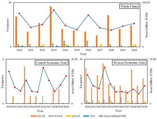 Figure 7 shows the temporal distribution characteristics of earthquake frequency in China from 2010 to 2020. The total occurrence of earthquakes also existed in three cutoff points during the study period, which were 28 in 2010, 36 in 2013, and 27 in 2018 in the whole of China. Table 4 (where p-values are all lower than 0.05) shows the correlation coefficient between earthquake occurrence and natural disaster losses in each region. In the whole of China, there is a positive correlation between the losses of natural disasters and earthquakes of magnitudes 5.0–5.5, 5.5–6.0, and 6.5 and above. For the Central Economic Zone, there is even a negative correlation between magnitude 5.0–5.5 and disaster losses, and a positive correlation between magnitude 5.5–6.0 and disaster losses. In addition, there is almost no correlation between natural disasters and earthquakes of magnitudes 6.0–6.5 and 6.5 and above in the Central Economic Zone. As for the Western Economic Zone, there is a relative strong positive correlation between the occurrence of earthquakes of magnitude 6.5 and above and the losses of natural disasters. We think the regional difference in seismic effects on natural disasters is that the Western Economic Zone is the most earthquake-prone region.