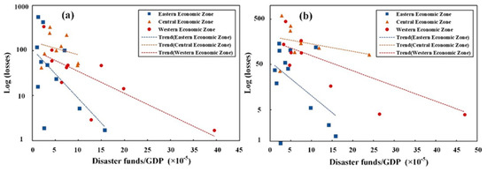 Relationships between direct economic losses from natural disasters and disaster funds in 2019 and 2020. (a) Relationships between direct economic losses from natural disasters and disaster funds obtained in 2019 (Eastern Economic Zone: R2 = 0.1833, Central Economic Zone: R2 = 0.0465, Western Economic Zone: R2 = 0.4783); (b) Relationships between direct economic losses from natural disasters and disaster funds obtained in 2020 (Eastern Economic Zone: R2 = 0.0524, Central Economic Zone: R2 = 0.1834, Western Economic Zone: R2 = 0.2099).