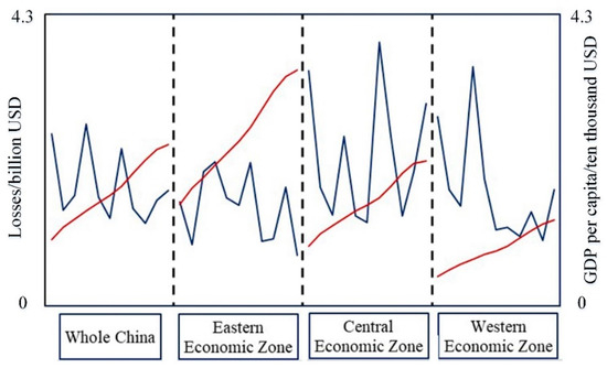 For this section, we selected per capita GDP and direct economic losses as indicators to discuss the impact of regional economies on disaster mitigation and reduction in China. As we can see in Figure 9, the Chinese economy has developed rapidly in the last 10 years, especially the Eastern Economic Zone. The Western Economic Zone has developed relatively slowly. In addition, the direct economic losses caused by natural disasters also show a fluctuating but decreasing trend, and the direct economic losses caused by natural disasters have a significant negative correlation with GDP per capita. It is worth mentioning that we found that disasters actually hinder economic growth, which is also consistent with the conclusions of related research results [57,58]. According to Figure 9, the annual direct economic losses caused by disasters in the Eastern Economic Zone were generally the least; on the contrary, its GDP per capita and GDP per capita growth rate were the highest. However, the Western Economic Zone had the largest direct economic losses caused by disasters every year; its GDP per capita was lower than the whole of China’s level, and its growth rate was the slowest.