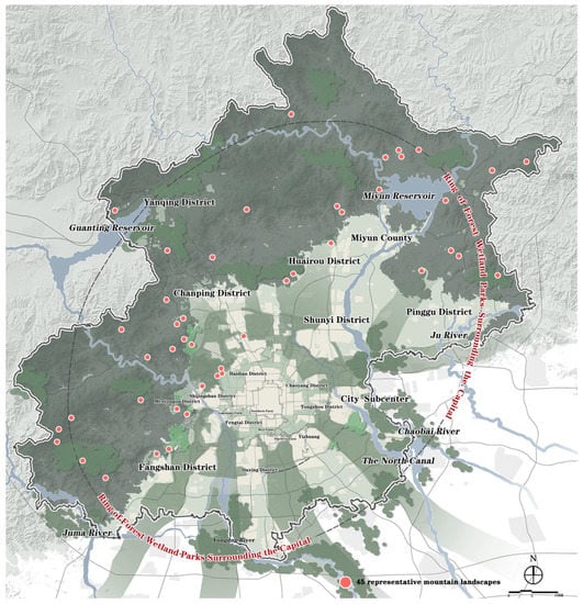 Figure 1. Distribution of the 45 representative mountain landscapes in Beijing.