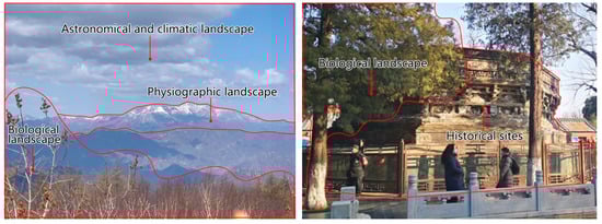 In all, 45 representative mountain landscapes in Beijing were selected as the research objects (Table 1, Figure 1). Generally, in Beijing, the mountains are clear and dangerous, and the terrain rises in steps, forming several levels of viewing platforms. Geological structure and lithology differ greatly, and the landforms are diverse and colorful. The higher the altitude of a scenic mountain, the more natural the scenery is; the lower the altitude, the more anthropic the scenery is. Religious temples are found on most of the tops or foothills of the cultural landscape mountains, indicating that religious culture has a profound influence on the mountains in the suburbs of Beijing. As well as being favored by residents, the temples are also revered by the royal family, illustrating the nexus between religion and politics. Beijing’s two mountain spaces, Xishan and Beishan, have significantly different associations with the scenery. A large number of scenic mountains are mostly associated with the content of the Great Wall in Beishan, Beijing, forming a natural cultural landscape similar to the Great Wall. The West Mountains in Xishan are devoid of Great Wall cultural landscapes, with the exception of the enemy towers along the River City.