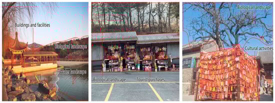 Based on the classification of landscape resources summarized in Table 2, 31,367 tourist photos were analyzed quantitatively for landscape elements. Tourists’ landscape preferences were determined according to the following order: physiographic landscape (9807, or 31.4%) > buildings and facilities (9000, or 28.8%) > biological landscape (5377, or 17.2%) > water landscape (4090, or 13.1%) > historical sites (1030, or 3.4%) > astronomical and climate landscapes (885, or 2.9%) > cultural activities (781, or 2.6%) > tourism purchases (162, or 0.6%).