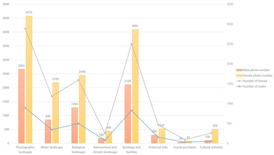 According to the differences in the gender, transportation mode, and travel mode of the tourists, the landscape preferences of the different groups were statistically analyzed. As far as gender is concerned (Figure 4), men and women tended to prefer the same types of landscapes, and they all showed an obvious preference for landscapes, architecture, and facilities, which is probably because mountain landscapes are dominated by natural landscapes, such as valleys and gullies, and tourists mainly go to scenic mountain spots for sightseeing, so the photos taken are mainly of buildings and places for sightseeing in the landscape. Table 6 presents an analysis of the images shared by people of different genders; men preferred physiographic landscapes, followed by biological landscapes and buildings and facilities, while women preferred water landscapes, followed by astronomical and climatic landscapes and cultural activities. From the perspective of humanistic activities, compared to men, women showed a greater preference for recording their personal activities during travel.