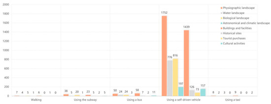 Figure 7. Analysis of tourists’ travel mode preferences with respect to different landscape resource types.