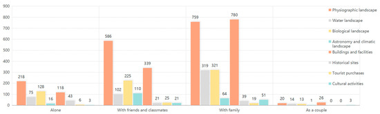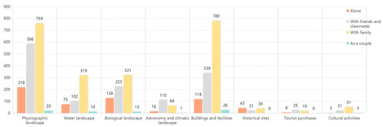 Figure 5 shows the differences in tourists’ landscape preferences when using different modes of transportation. Irrespective of the mode of transportation, tourists preferred physiographic landscapes, buildings and facilities, biological landscapes, and water landscapes. However, this choice was more obvious when using a self-driven vehicle. Figure 6 shows the differences in tourists’ landscape preferences according to their different modes of travel. Tourists who traveled with their families and partners preferred buildings and facilities, followed by physiographic landscapes, and the degrees of interest were similar between biological landscapes and water landscapes. Tourists who traveled alone or with friends and classmates were more interested in landscapes than in buildings and facilities, and their interest in biological landscapes was also greater than their interest in water landscapes. With regard to the different types of landscape resources, there were certain differences in tourists’ travel patterns. As can be seen in Figure 7, tourists who traveled with friends and classmates preferred astronomical and climatic landscapes and tourism purchases.