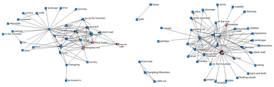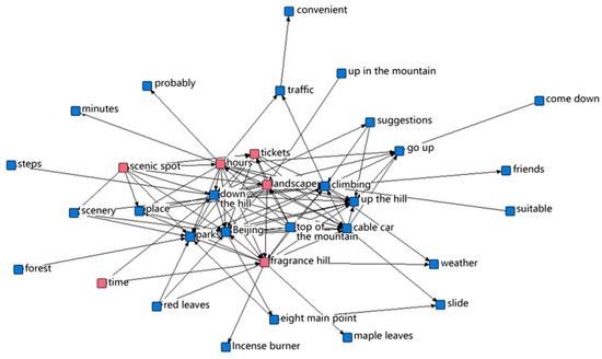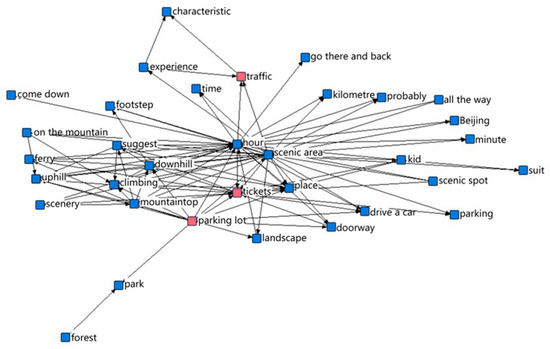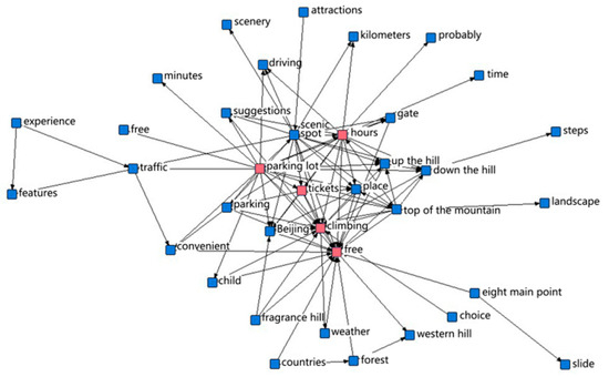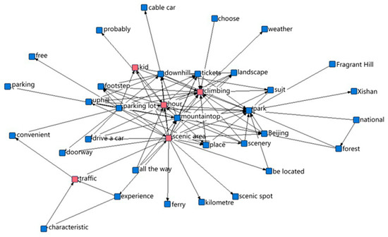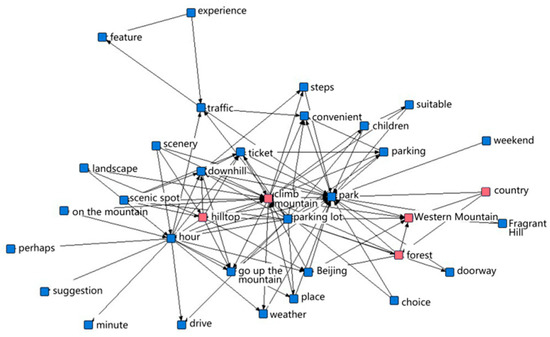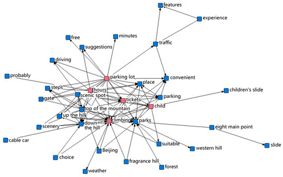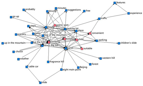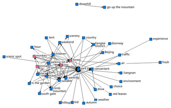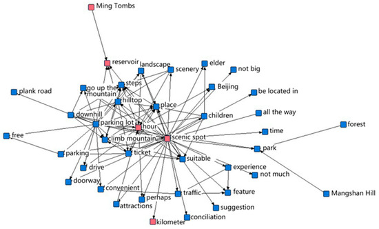 To further understand tourists’ preferences for recreation types and feelings regarding Beijing’s mountain landscapes, word segmentation and word frequency analysis were performed by using ROSTCM6 to evaluate the texts of the review users, and the 30 words related to recreation and emotional experience with the highest frequency were extracted (Figure 8). By and large, tourists tended to show seven recreational behaviors related to mountain landscapes: climbing, rafting, hiking, fitness, camping, picnicking, and sightseeing. Moreover, their emotional experiences were dominated by positive words, such as “suitable”, “convenient”, “characteristic”, and “beautiful”, all of which show a positive attitude. It can be seen that tourists loved the overall landscapes and environments of the mountains. The authors of this study extracted the texts of positive reviews by users for semantic network analysis and generated a positive semantic network diagram (Figure 9). The texts of negative user evaluations were also extracted for semantic network analysis, and a negative semantic network diagram was generated (Figure 10). The nodes represent high-frequency vocabulary elements, and the density of connections between elements represents the co-occurrence frequency. The factors of positive evaluations of the mountain landscape were mainly reflected in the beautiful scenery, suitability for outings, traffic accessibility, recreational facilities, and parent-child experiences. The negative factors of the evaluations were mainly reflected in tickets, transportation, infrastructure, and park management services. Although the overall evaluation of the mountain landscape is high, it does not necessarily imply that the parks are well-managed. The management of a forest park involves many complex aspects that are not readily apparent to the public. Negative feedback recorded on social media indicates that tickets, transportation, infrastructure, and park management services may not need to be improved, rather, the meaning implies that the management mode may need to be reviewed.
