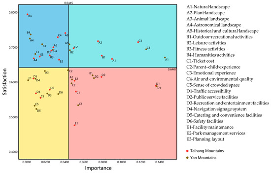The IPA (Table 10, Figure 21) of mountain landscapes in different mountain ranges showed that tourists were more satisfied with the overall recreation offered by the mountain landscapes in the Taihang Mountains than those offered by the Yan Mountains. Tourists loved the mountain landscapes in the Taihang Mountains in terms of plant landscapes and outdoor recreational activities, while the mountain landscapes in the Yan Mountains were more distinctive in terms of historical and cultural landscapes and leisure activities. In terms of traffic accessibility, public service facilities, ticket cost, and park management services, there was a need for further strengthening and improvement of the facilities. The plant landscapes and the outdoor recreational activities offered in the Yan Mountains had higher importance but a lower satisfaction rating than the average. Therefore, the mountain landscape in the Yan Mountains needs to be improved.