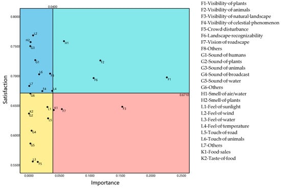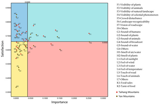For the landscapes of different mountain ranges, the IPA (Table 12, Figure 23) showed that, similarly to the conclusion regarding tourists’ satisfaction with recreation, tourists’ satisfaction with the mountain landscapes in terms of the five senses was higher for the Taihang Mountains than for the Yan Mountains. The Taihang Mountains were characterized by the visibility of plants, the visibility of animals, landscape recognizability, the smell of air/water, and other visual and olfactory landscape elements that were highly valued, while the tourists in the Yan Mountains attached more importance to the visibility of natural landscapes, landscape recognizability, the visibility of roads, smell of air/water, and the feel of temperature, as well as other visual, olfactory, and tactile landscape elements. That is, tourists in both mountain landscapes attached more importance to visual and olfactory sensory feelings. In terms of sensory elements in urgent need of key improvement, for the Taihang Mountains, more attention should be paid to improving the visibility of natural landscapes, the visibility of roads, and food sales, and for the Yan Mountains, more attention should be paid to the visibility of plants, the visibility of animals, and food sales. Thus, it is clear that both need to improve the sensory experiences of vision and taste.