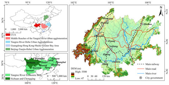 The CUA is located at the intersection of “the Belt and Road” and Yangtze River Economic Belt strategies, with Chongqing and Chengdu as core, and includes 14 other cities: Zigong, Luzhou, Deyang, Mianyang, Suining, Neijiang, Leshan, Nanchong, Meishan, Yibin, Guang’an, Dazhou, Ya’an, Ziyang (Figure 1). Based on the need for fine-grained analysis, the sampling requirements for the regression, and the availability of statistical data in the control variables, the assessment and analyses were conducted using geographic grid units and administrative divisions.