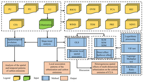 There are some shortcomings in this study. First, while the Landsat images used in this study can generate regional land use structure, there is still room to improve the resolution of the dataset by using other remote sensing images. Future research can utilize global land-use datasets released by ESRI or ESA at 10 m resolution to improve the accuracy of quantifying the level of land urbanization. Second, this study focuses on the driving effect of multi-dimensional urbanization on carbon emissions in the CUA observed in previous years, but future development trends and possible correlation changes between variables were not thoroughly explored. Subsequent studies can explore the use of FLUS, CA-Markov, or deep learning methods to simulate and predict the development scenarios of urbanization and carbon emissions. Third, some of the remote sensing data used in this study may be affected by the noise brought by atmospheric conditions and clouds to some extent, and future studies will combine remote sensing technology to solve the error effects brought by these noises and increase the scientificity of data use.