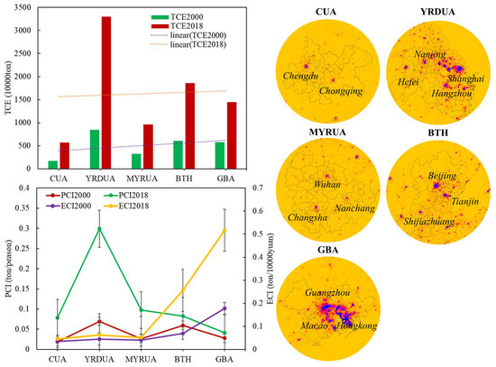 Comparison of TCE, PCI and ECI of the five national strategic urban agglomerations in China, 2000–2018.