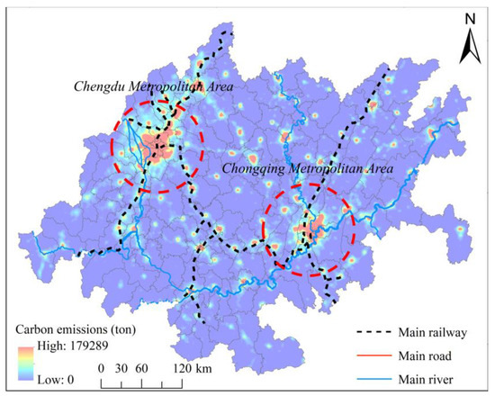 The carbon emission data for 2000–2018 was processed using ArcGIS to obtain the spatial average carbon emission of CUA (see Figure 5). The figure shows a spatial pattern of high emission values in the Chengdu and Chongqing Metropolitan areas, gradually dissipating towards the peripheries. Aside from the urban centers, high carbon emission values can be found along the railroads and rivers, possibly due to the long history of urban construction, the high concentration of population and industries in these areas.