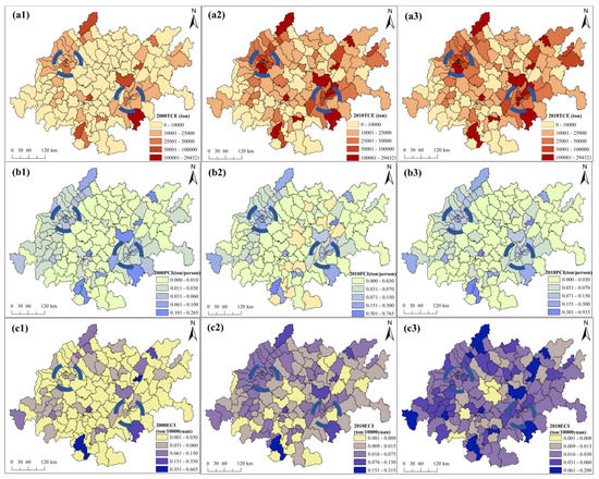 ArcGIS-based regional statistical tools and spatial interpolation were used to analyze the distribution patterns for TCE, PCI and ECI at the administrative division level (see Figure 6). In terms of TCE, the increases in TCE values were in or near the Chengdu and Chongqing metropolitan areas. In 2000, high-value areas for TCE were mainly scattered in Qijiang District, Jiangyou City, and Gao County; by 2010 and 2018, the high-value areas were clustered in the Chengdu and Chongqing metropolitan areas, particularly in Qijiang District, Hechuan District, Yubei District in Chongqing and Shuangliu District and Wuhou District in Chengdu, where TCE exceeded 160,000 tons in 2018. This could be caused by the “strong provincial capital” policy implemented in recent years, which has produced substantial productive enterprises and factories in the region, generating higher demand for energy consumption.