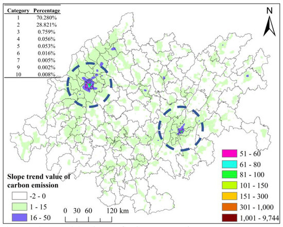 Slope trend distribution of carbon emissions from 2000 to 2018.