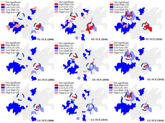 We calculated the indices for the population, economic, and land urbanization of the 142 county-level units in the CUA, and the local variability of the spatial association between multi-dimensional urbanization and carbon emissions was quantified using the bivariate local spatial autocorrelation tool on the GeoDA platform. As shown by the results in Figure 8, the “Low-Low” positive correlation was the main cluster type, while the proportion of the “High-High” positive correlation gradually increased in the association effect. County units where carbon emissions clustering positively correlated with population, economic, and land urbanization increased from 14.08%, 20.42%, and 20.42% in 2000 to 28.87%, 27.46%, and 29.58% in 2018. This implies that the synergistic growth trend of multi-dimensional urbanization and carbon emissions has accelerated significantly and that urbanization strategies have to be urgently adjusted to accommodate regional carbon emission reduction targets.
