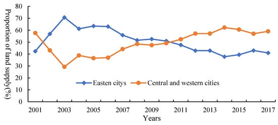 The improvement of TFP is an inherent requirement of high-quality economic development, and the optimization of factor allocation is one of the effective paths toward this requirement [1]. China’s capital and labor factor markets are relatively perfect, but the land factor market is influenced by the land grant system and local government behavior, and there are problems such as excessive government intervention and the distortion of land resource allocation [2]. In 2003, in order to coordinate regional development, the central government of China tilted the spatial distribution of land supply to the central and western regions. The research found that this policy of the regional differentiation of land supply has greatly increased the proportion of land supply in the central and western regions [3]. As shown in Figure 1, from 2003 to 2017, the proportion of land supply in the central and western regions of China increased from 29.31% to 59.06%. During the same period, the proportion of land supply in the eastern region decreased from 70.69% to 40.94%, resulting in the spatial misallocation of land, which led to a series of economic and social problems. For example, the decrease in land supply in eastern China led to a rise in housing prices, which raised the threshold for the rural migrant population to settle down in cities and pushed up the semi-urbanization rate [4,5,6]. At the same time, the central and western regions fell into a vicious circle of “new city development—land mortgage and refinancing—new city expansion and construction” with the advancement of the construction land index, resulting in a large number of “empty cities” and “ghost cities”, and a high debt rate of local governments [7]. The above studies on housing prices, urbanization, government debt and other issues are all manifestations of obstacles to the improvement of TFP. A systematic study on the impact of the regional differentiation of land supply on TFP in China and the mechanism of its effect can help to fundamentally respond to the above problems.