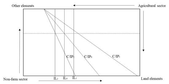 Li‘s research shows that R&D and innovation are important ways to promote technological progress and raise the level of the production frontier, and that the supply of land resources, as an important carrier of urban production and innovation activities, is closely related to urban innovation [23]. Specifically (Figure 2), it is assumed that the initial supply and land price of construction land is IL0 and IP0, respectively. With the contraction of land supply in the eastern region, the supply will decrease to IL2, and the corresponding land price will increase to IP2 (IP2 > IP0). For the same equal cost curve, the slope C/IP2 < C/IP0 indicates that the technology substitution rate of C/IP2 is greater than C/IP0, so the reduction in land supply in the eastern region will induce other factors to replace land elements. According to the price-induced progress hypothesis and the innovation compensation effect [24,25], an increase in land price will force enterprises to reduce costs through innovation, especially in the eastern region of China, where the national high-tech zones account for 40% of the country in 2020, and the R&D expenditure accounted for 67.7% of the country, intensifying the innovation competition between enterprises and causing the technology substitution effect caused by the land price increase to be more significant. In addition, in the case of a scarcity of land indicators, local governments in the eastern region are more cautious in the use of construction land indicators and take the initiative to screen stronger high-end enterprises that are in line with industrial development trends. For example, in recent years, many places in the Yangtze River Delta and the Pearl River Delta have introduced industrial development support policies to ensure the landing of key industries and major projects, and this screening behavior of local governments will enable enterprises with stronger innovation capabilities to settle in and promote the industry in the direction of high-end development, which in turn will promote TE and TFP.