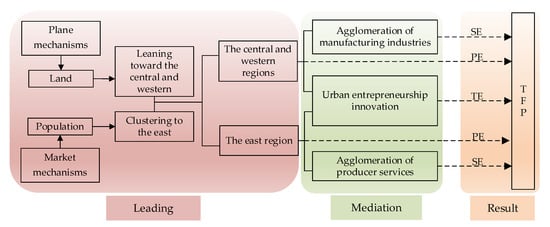 The existing studies have provided an important theoretical basis for this paper, but there are several shortcomings and much room for improvement: first, the existing studies capture the phenomenon of the spatial mismatch of construction land but ignore the fact that the government’s differential allocation violates the marginal output-by-optimality, which is the deep-seated cause of the mismatch. Therefore, focusing on the regional differentiation of government land supply will help enrich the theoretical system of construction land allocation. Second, these studies have attempted to analyze the influencing factors of TFP, but have not subdivided TFP, which blurs the connotation of technical progress, pure technical efficiency and scale efficiency included in TFP, and makes it difficult to accurately grasp the specific path of impact. Therefore, this paper will decompose TFP, and explore how the regional differentiation of land supply affects TFP through the decomposition item. Third, as for the mechanism of influence of land supply on TFP, existing studies have conducted exploration from the perspectives of environmental regulation, industrial land prices and wages, but have only analyzed the impact on TFP. This paper will refine the research perspective and construct a one-to-one correspondence mechanism of influence for urban innovation–TE, and industrial agglomeration–SE. The rest of this paper is organized as follows: the second part provides the mechanism of influence and theoretical hypothesis; the third details the research methods and data sources; the fourth describes the results; and the fifth presents the conclusion and discussion.