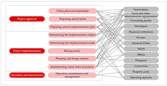 The entire process of urban renewal and corresponding stakeholders (by authors).