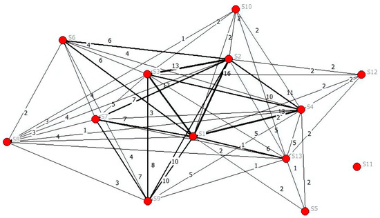 Because this phenomenon, which is difficult to quantify, can be measured visually, many studies combine stakeholder analysis with SNA [30,31] to understand the complex formal and informal relationships between many stakeholders [32]. Contrary to traditional networks that only consider one node type, two-mode SNA studies the relationship between two different nodes. This link exists only between different node types and is used to evaluate the relationship between individuals and their attributes [33].