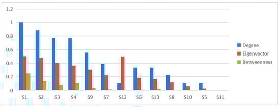The SNA can explain the position, rights, and influence of each node in the relationship network as well as the influence and constraint of one party on another party. Centrality is an important method for analyzing network characteristics [24]. To further explore the influence of stakeholders on barriers, we chose degree centrality, eigenvector centrality, and betweenness centrality to measure and analyze network centrality.