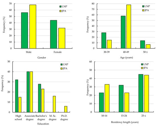 In this research, we interviewed 352 and 382 respondents for LNP and JPA protected areas, respectively (Figure 1). Males from the respondents were the majority of survey participants in LNP and JPA between 40 and 49 years of age. In terms of education level, most survey participants held associate degrees. In addition, most had been local residents for equal to or more than 25 years.