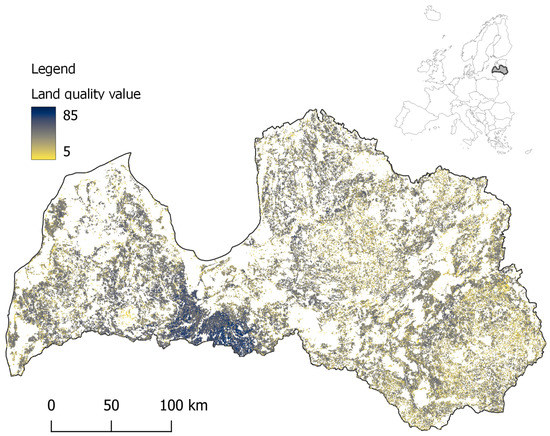 Distribution of land-quality values of agricultural land in Latvia.