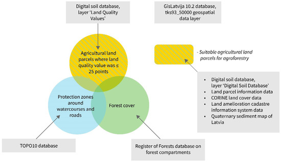 The next steps included the exclusion of land parcels with forest cover by overlapping the State Forest Service data layer and exclusion of protection zones around watercourses and roads, which are subject to the Protection Zone Law [47]. Respectively, 12 m–wide buffer strips around the axis of the ditches (distance was measured from the central axis; it was assumed that the average width of ditches is 4 m) and 10 m–wide buffer strips along the other watercourses and roads (distance was measured from the edge of the bank of the river, coastline, or road) were excluded from further analysis. Thus, selected suitable agricultural land for agroforestry consists of agricultural land parcels with land quality value ≤ 25 points, excluding areas with forest cover and buffers (protection zones) around watercourses and roads. The spatial-data-processing framework is shown in Figure 2, which represents our workflow for selecting suitable land parcels for agroforestry systems (agrisilvicultural and agrosylvopastoral systems).